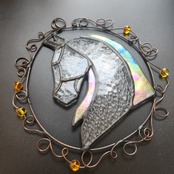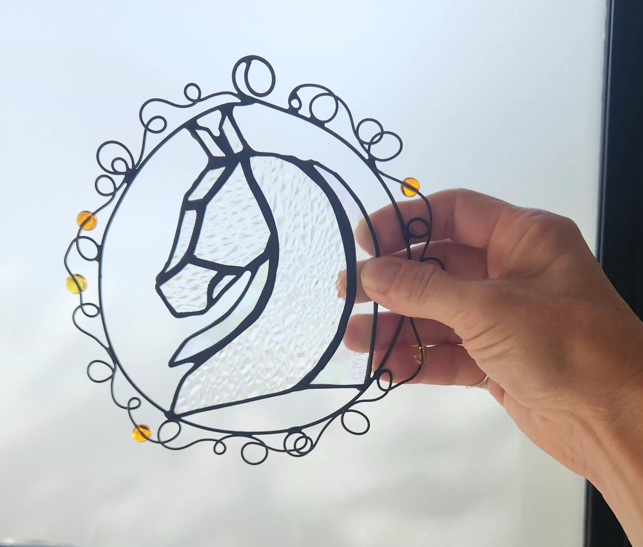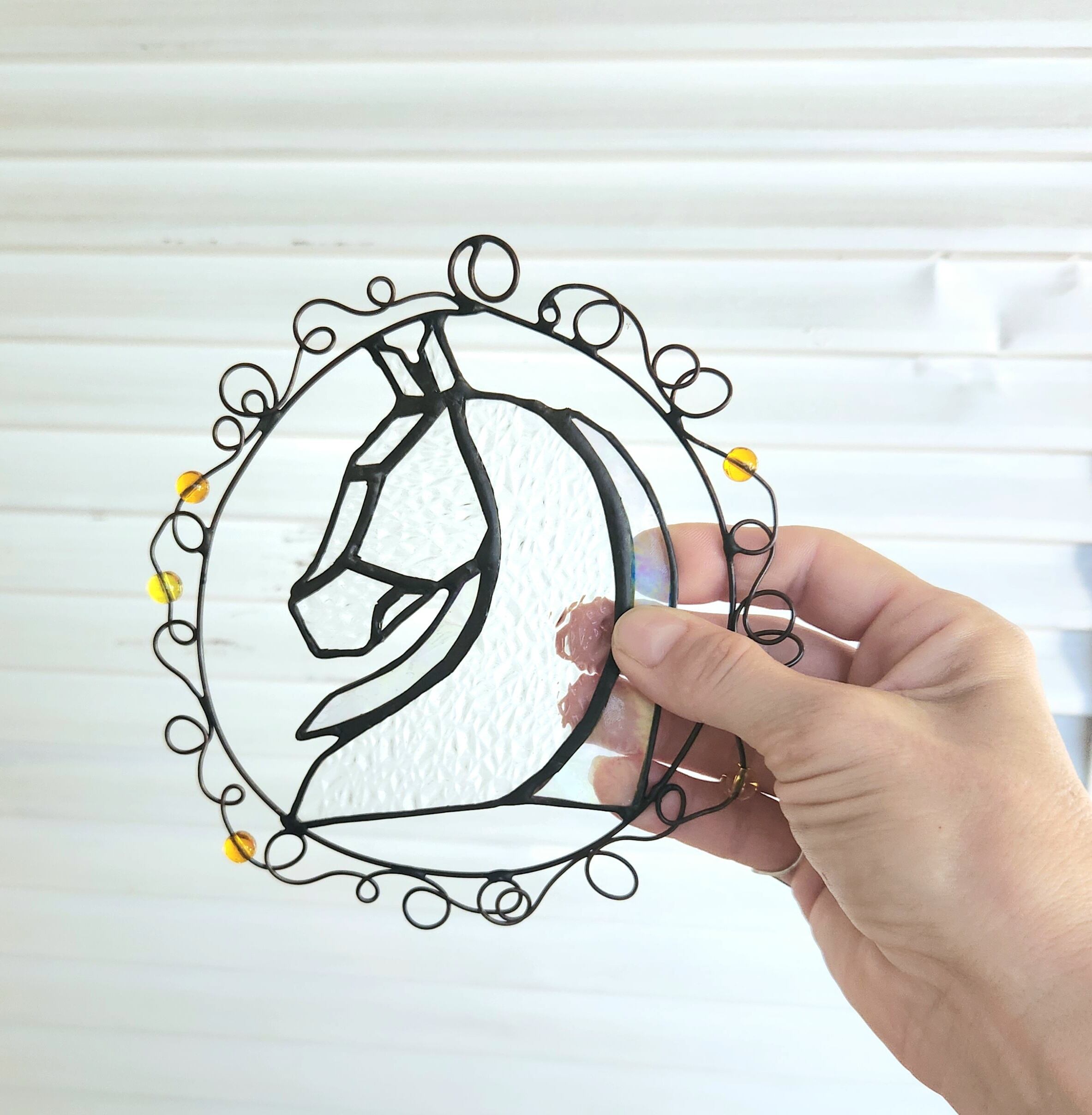 さまざまな種類の透明ガラスを組み合わせて作られた、馬の横顔をモチーフにしたサンキャッチャーです。