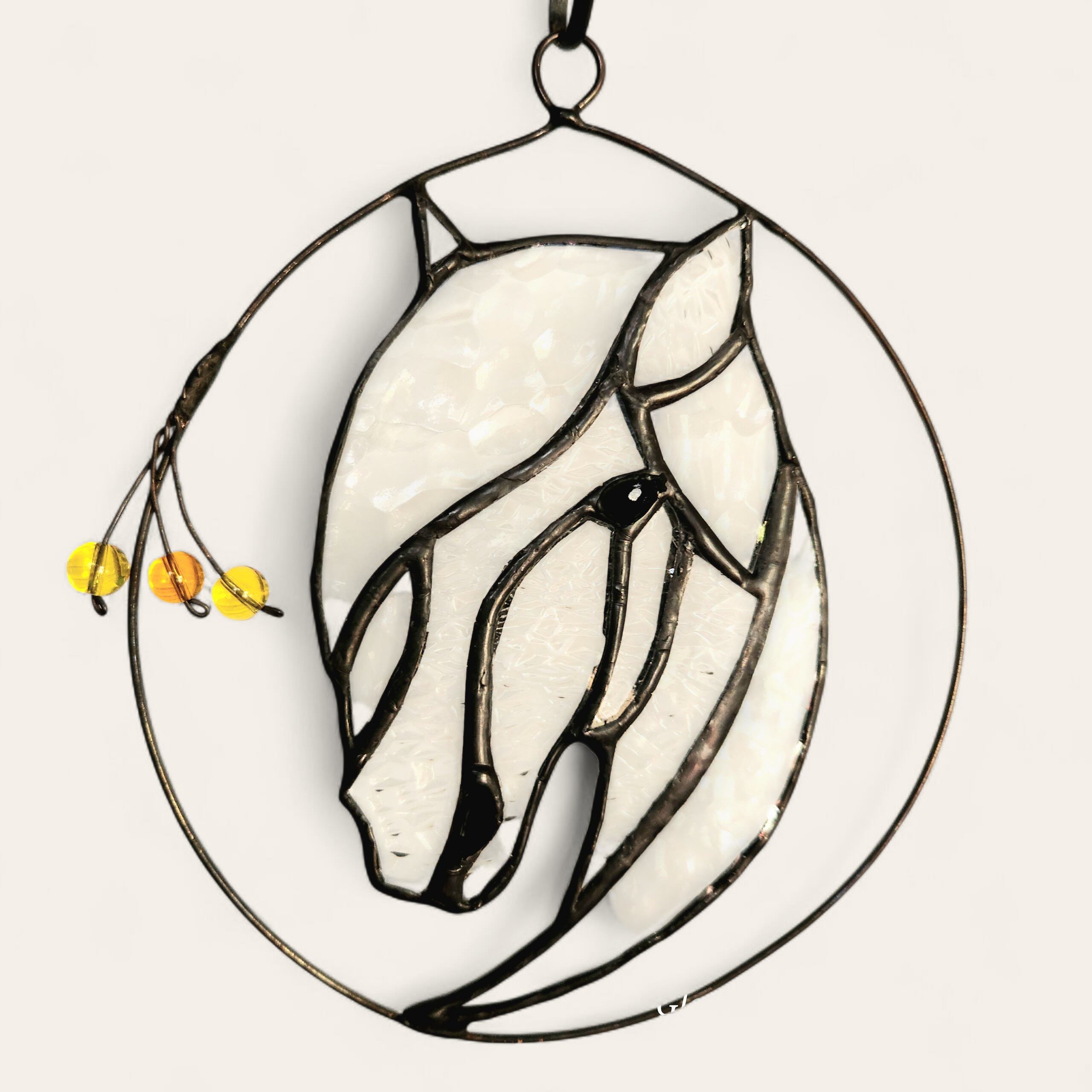 さまざまな種類の透明ガラスを組み合わせて作られた、馬の顔をモチーフにしたサンキャッチャーです。
