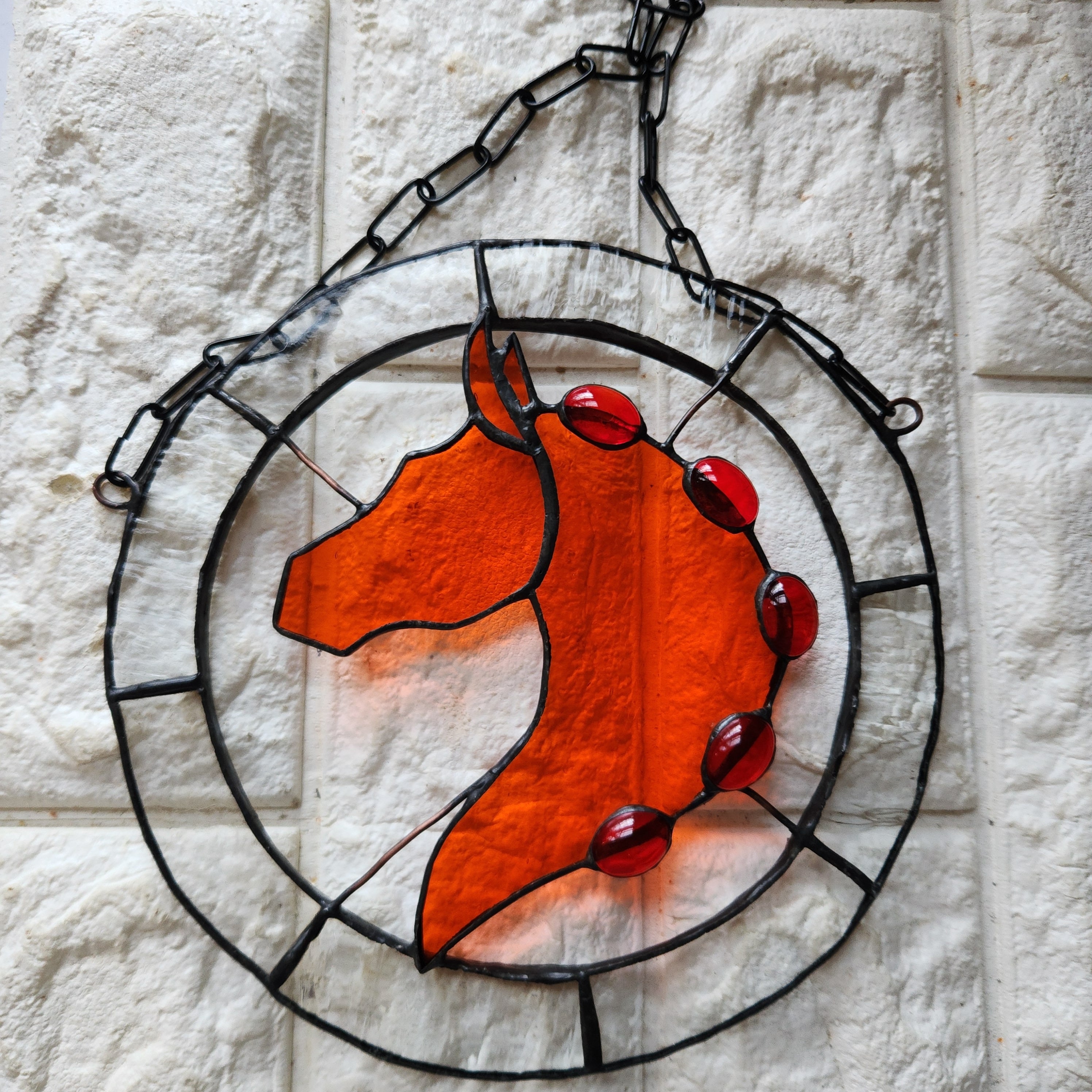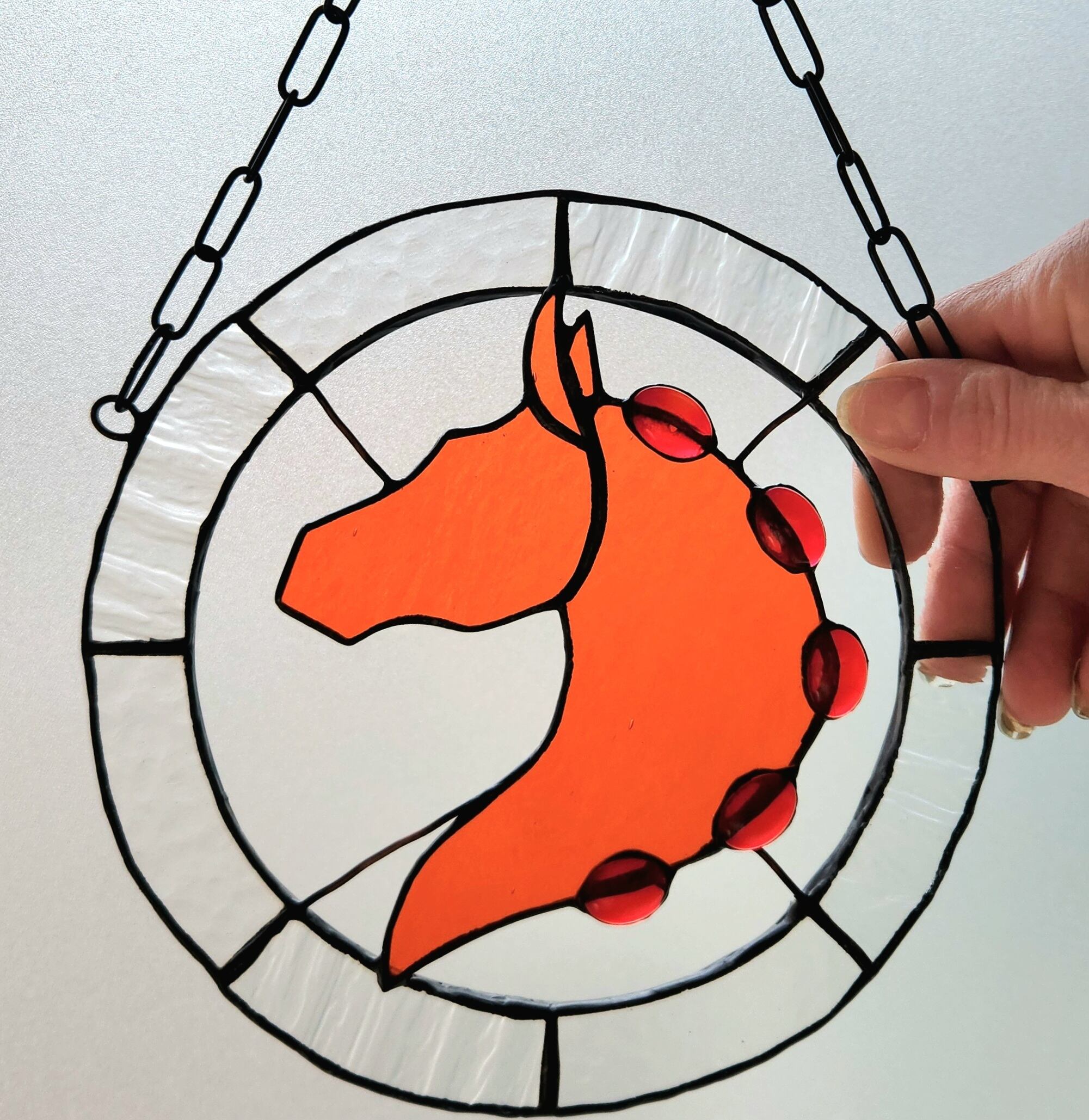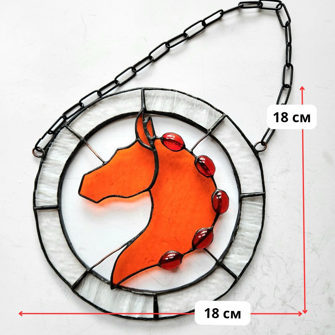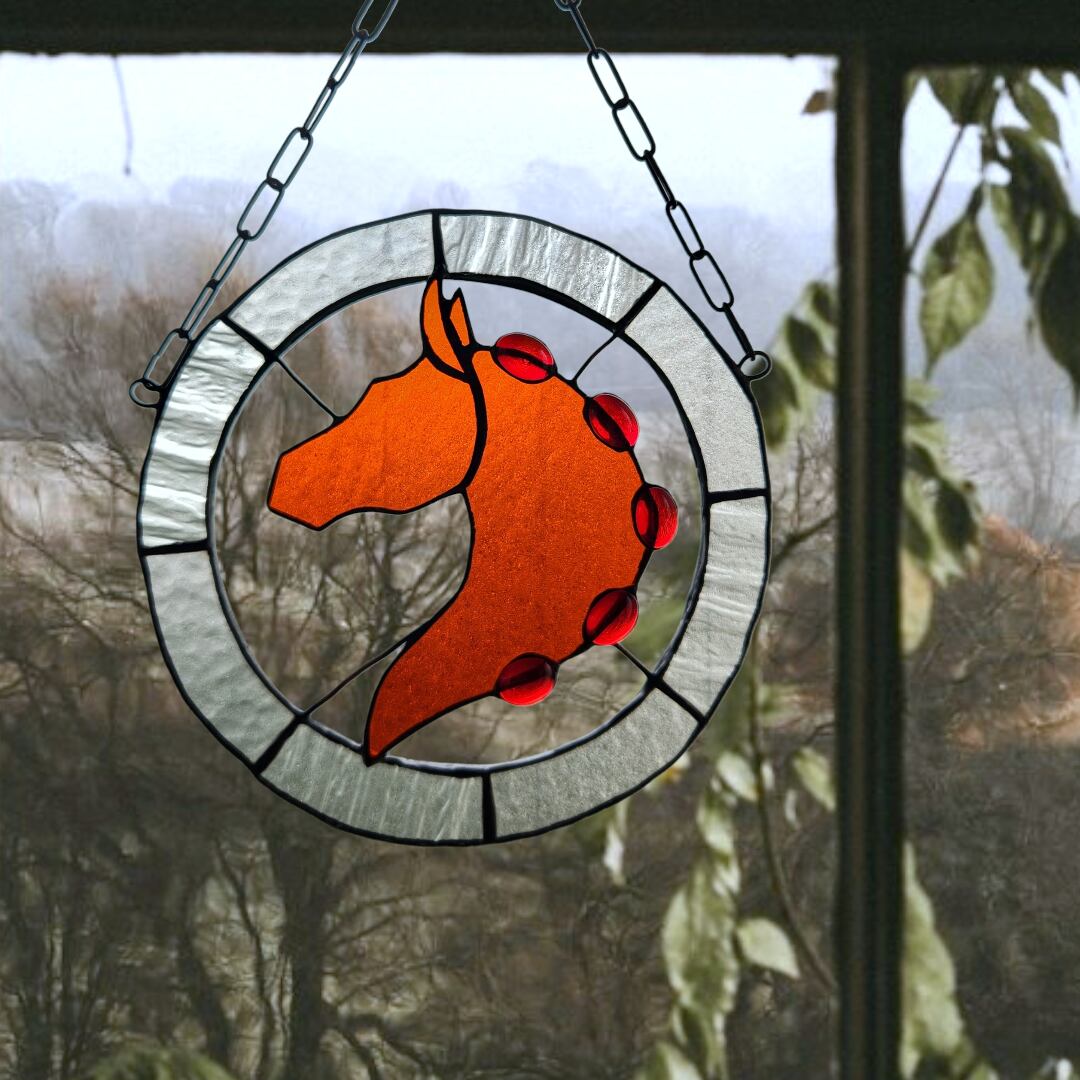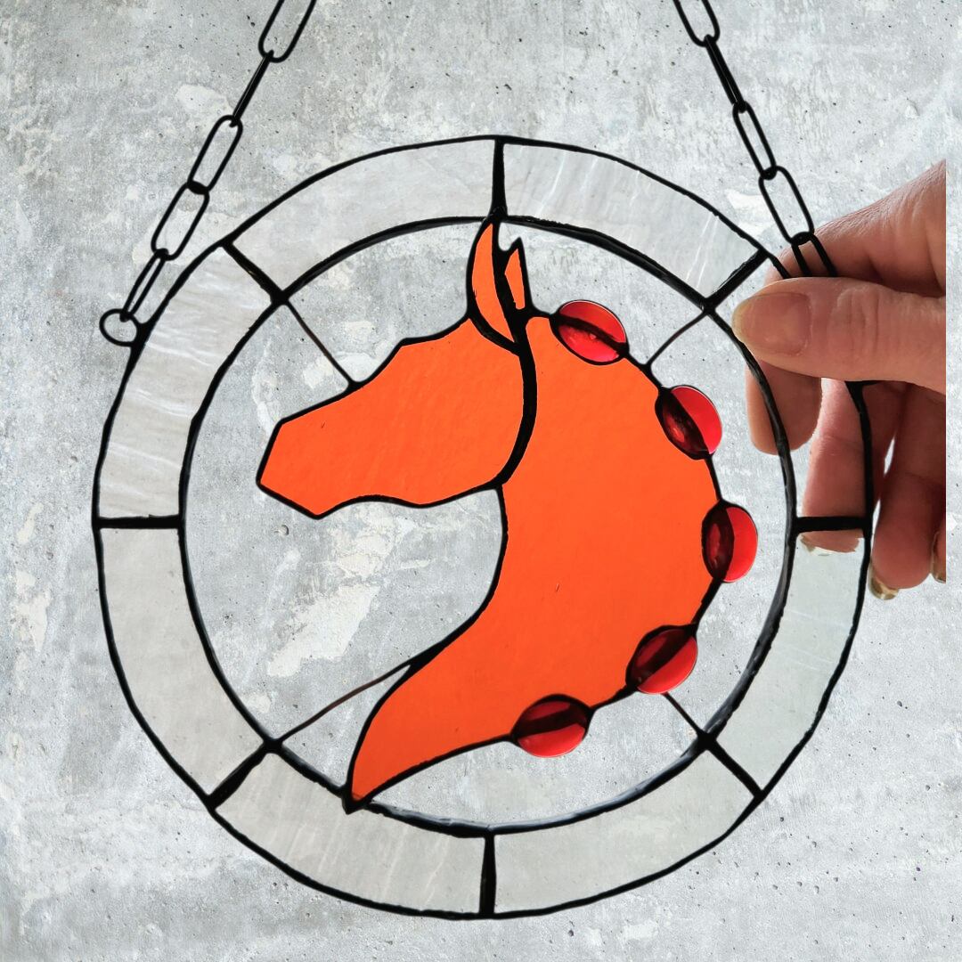 透明感のあるオレンジ色のガラスで表現した、馬の頭部と首のシルエットを円形のステンドグラスに収めたサンキャッチャーです。シルエット部分にはガラスカボションをあしらい、光を受けることで奥行きのある表情が生まれます。