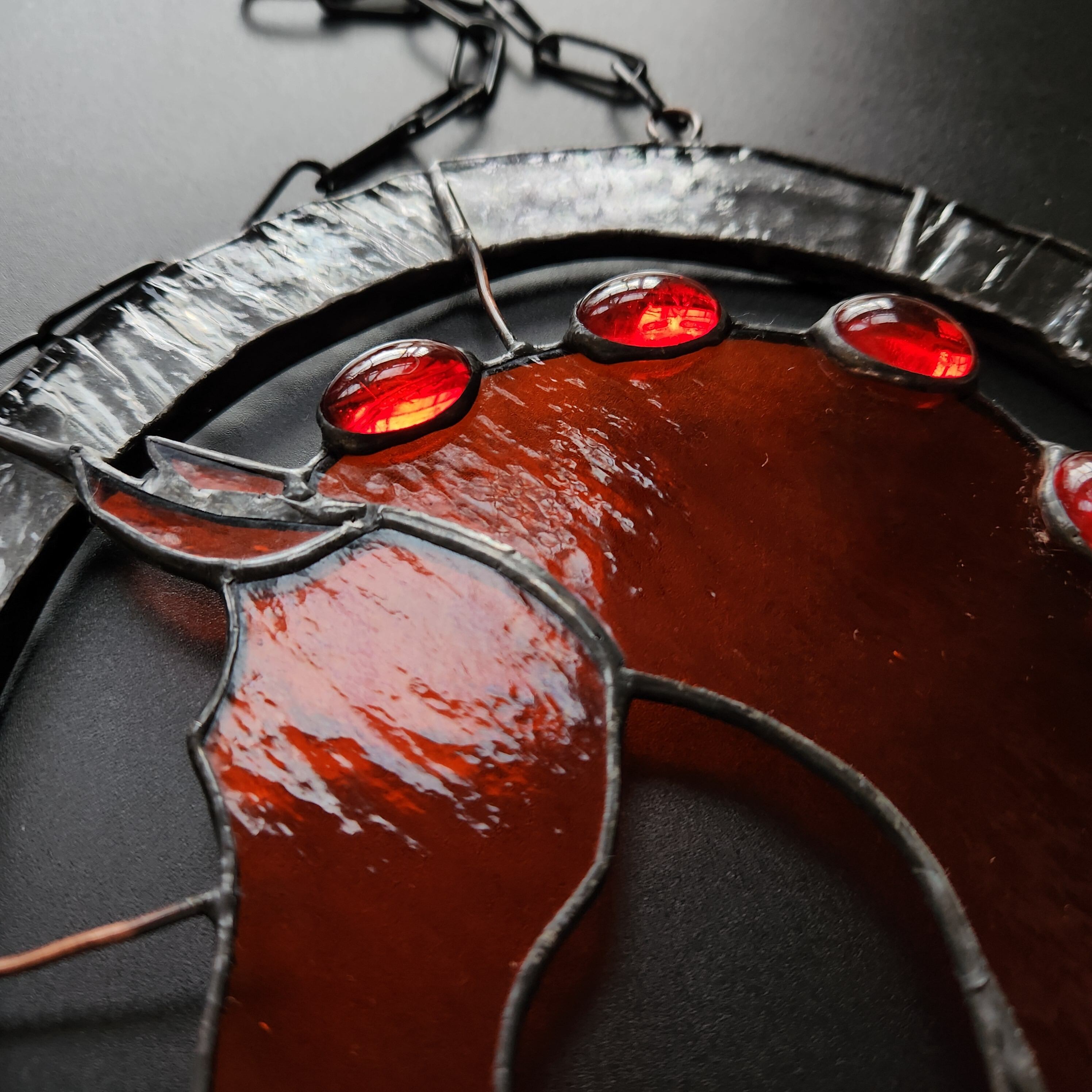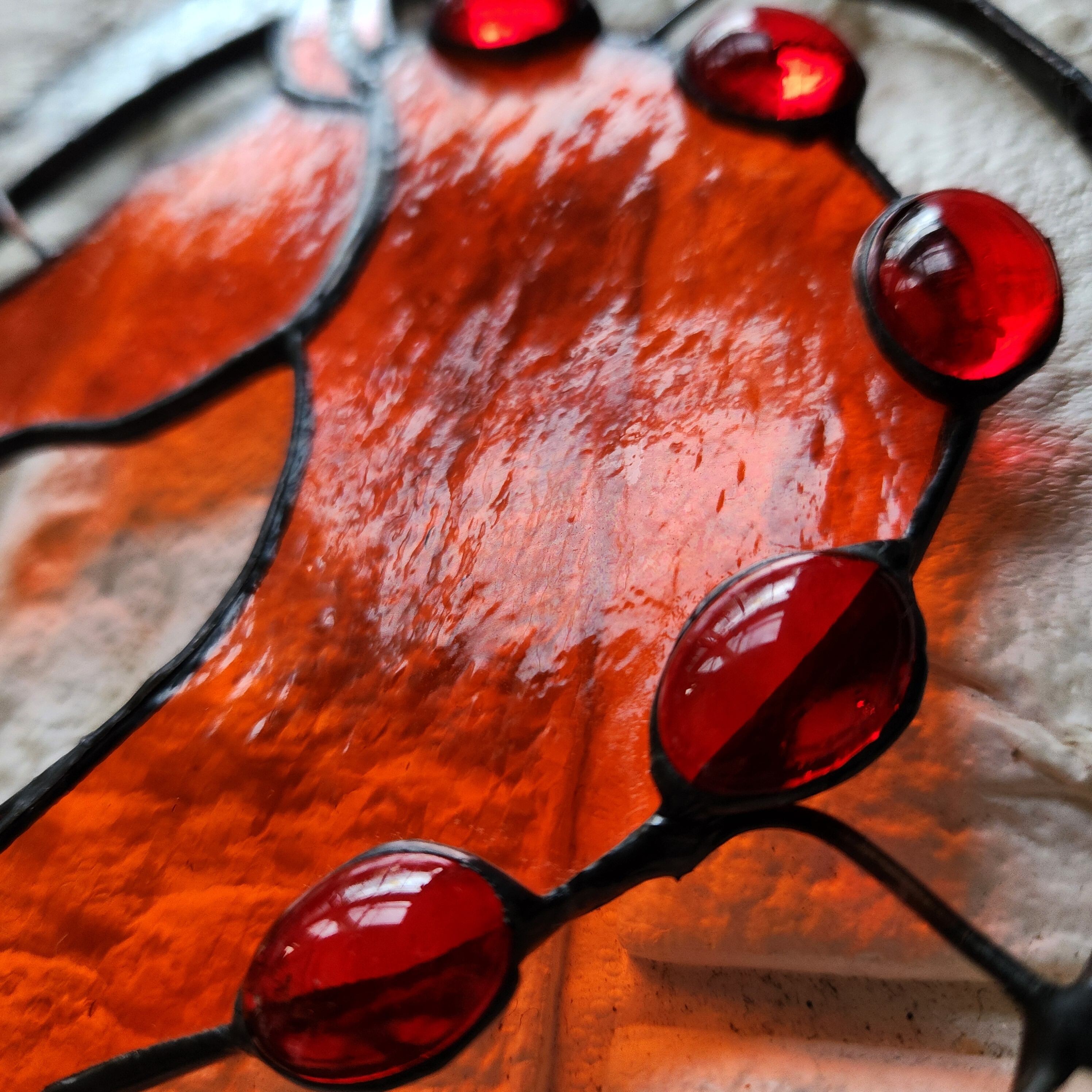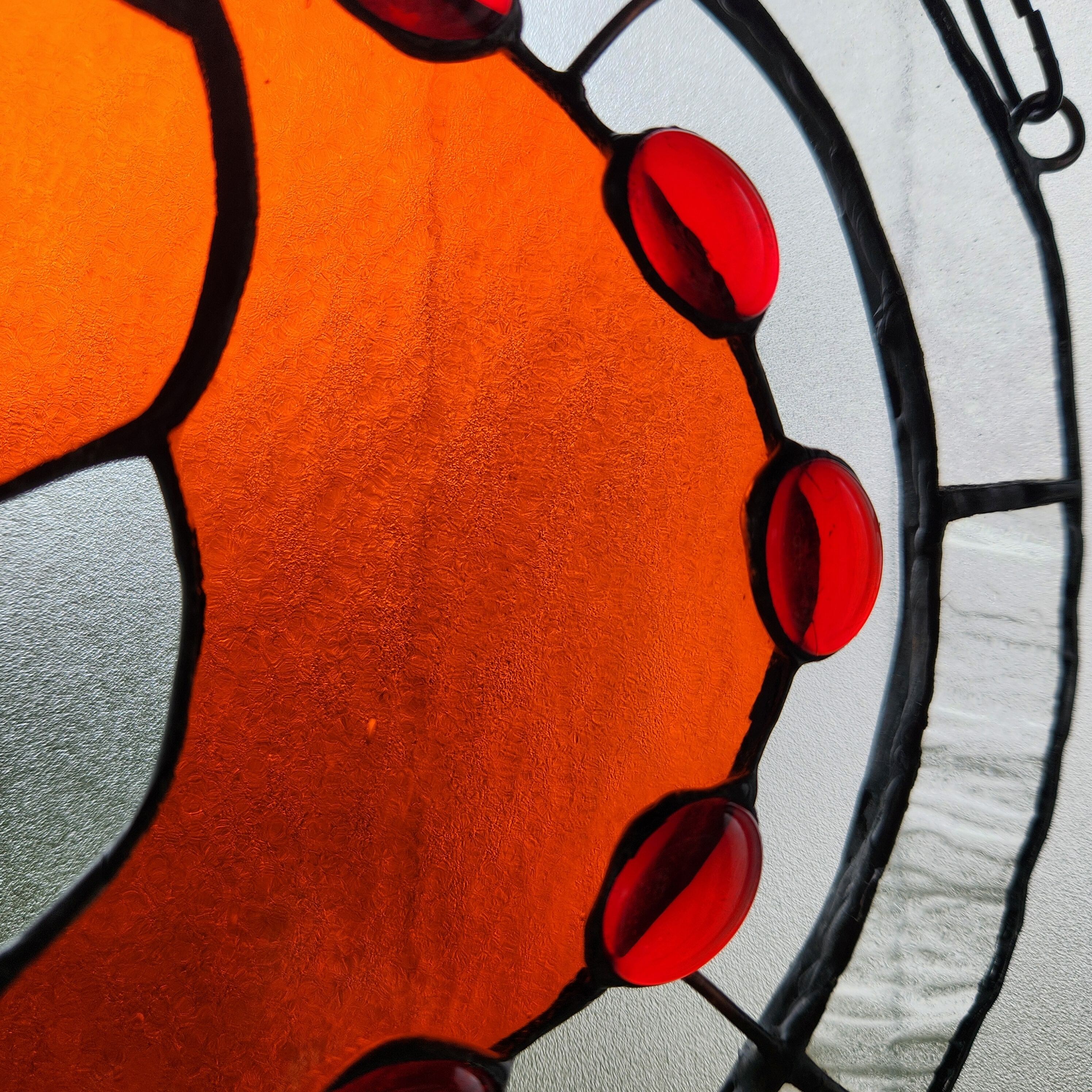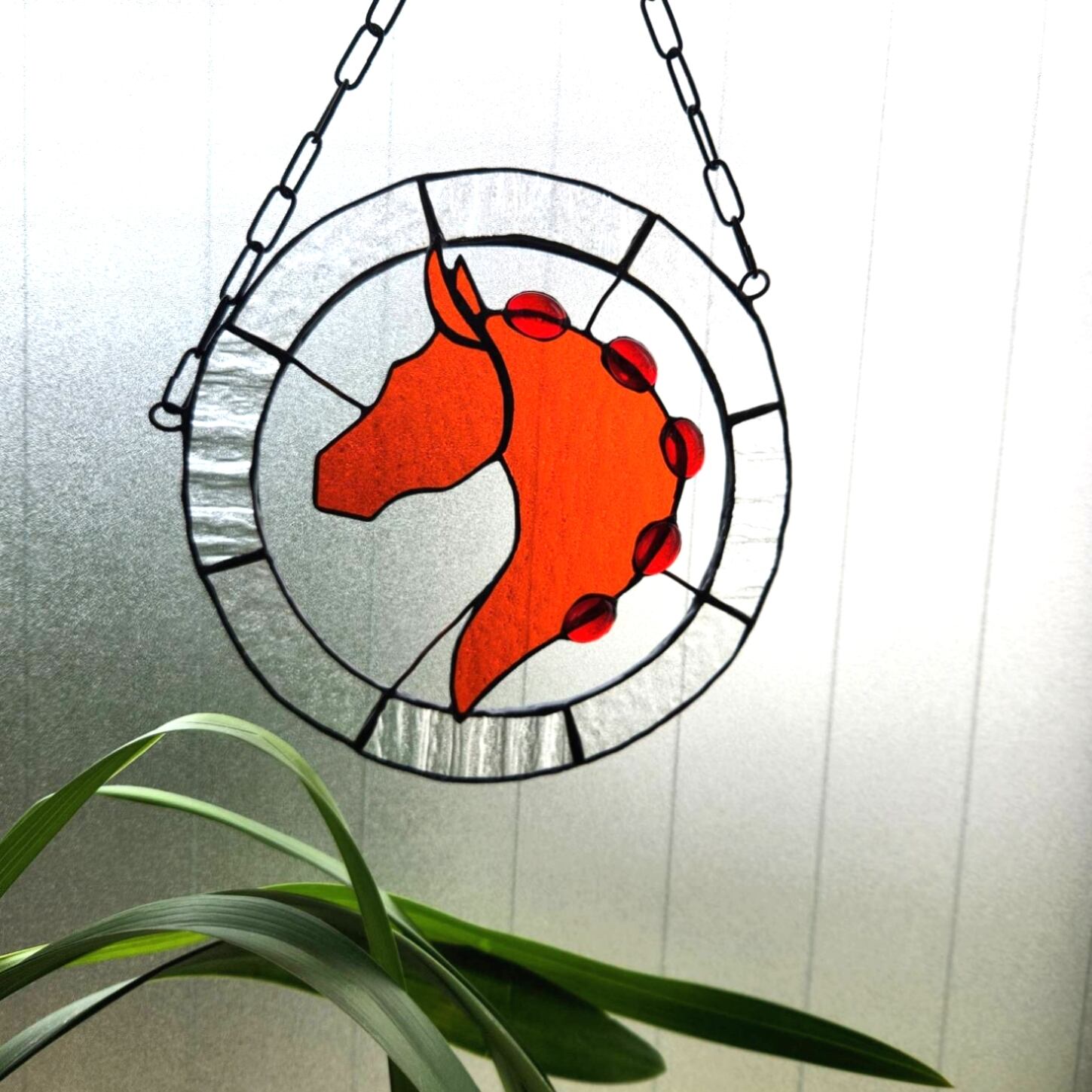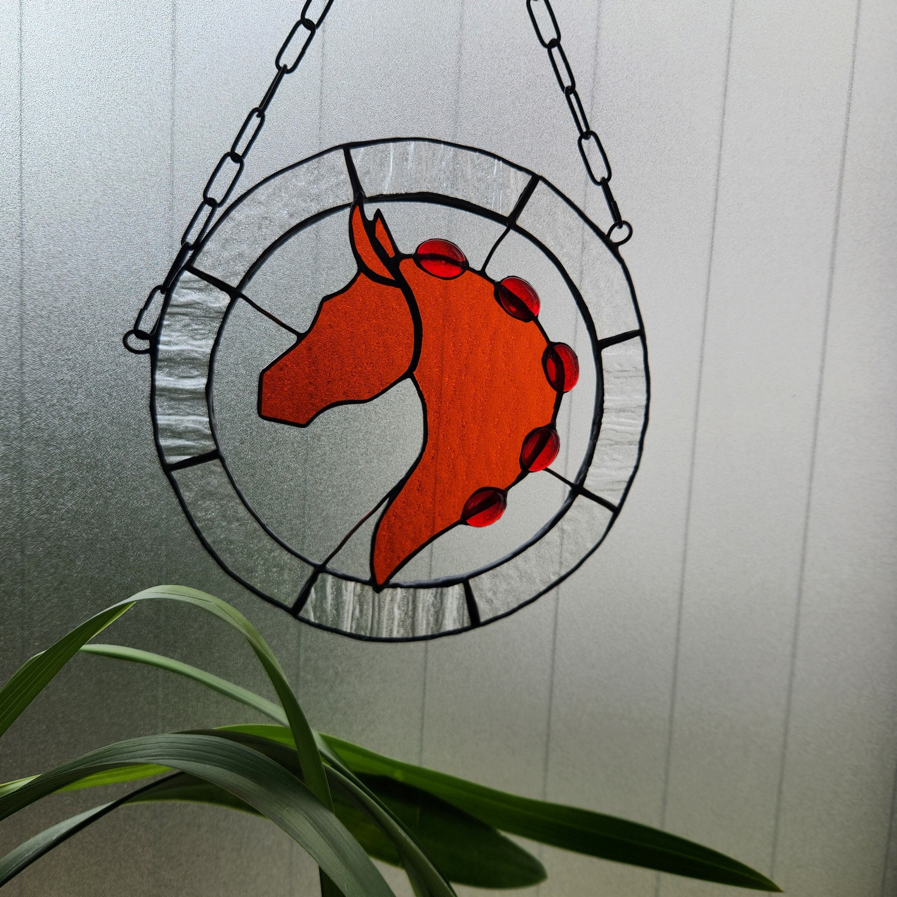 透明感のあるオレンジ色のガラスで表現した、馬の頭部と首のシルエットを円形のステンドグラスに収めたサンキャッチャーです。シルエット部分にはガラスカボションをあしらい、光を受けることで奥行きのある表情が生まれます。