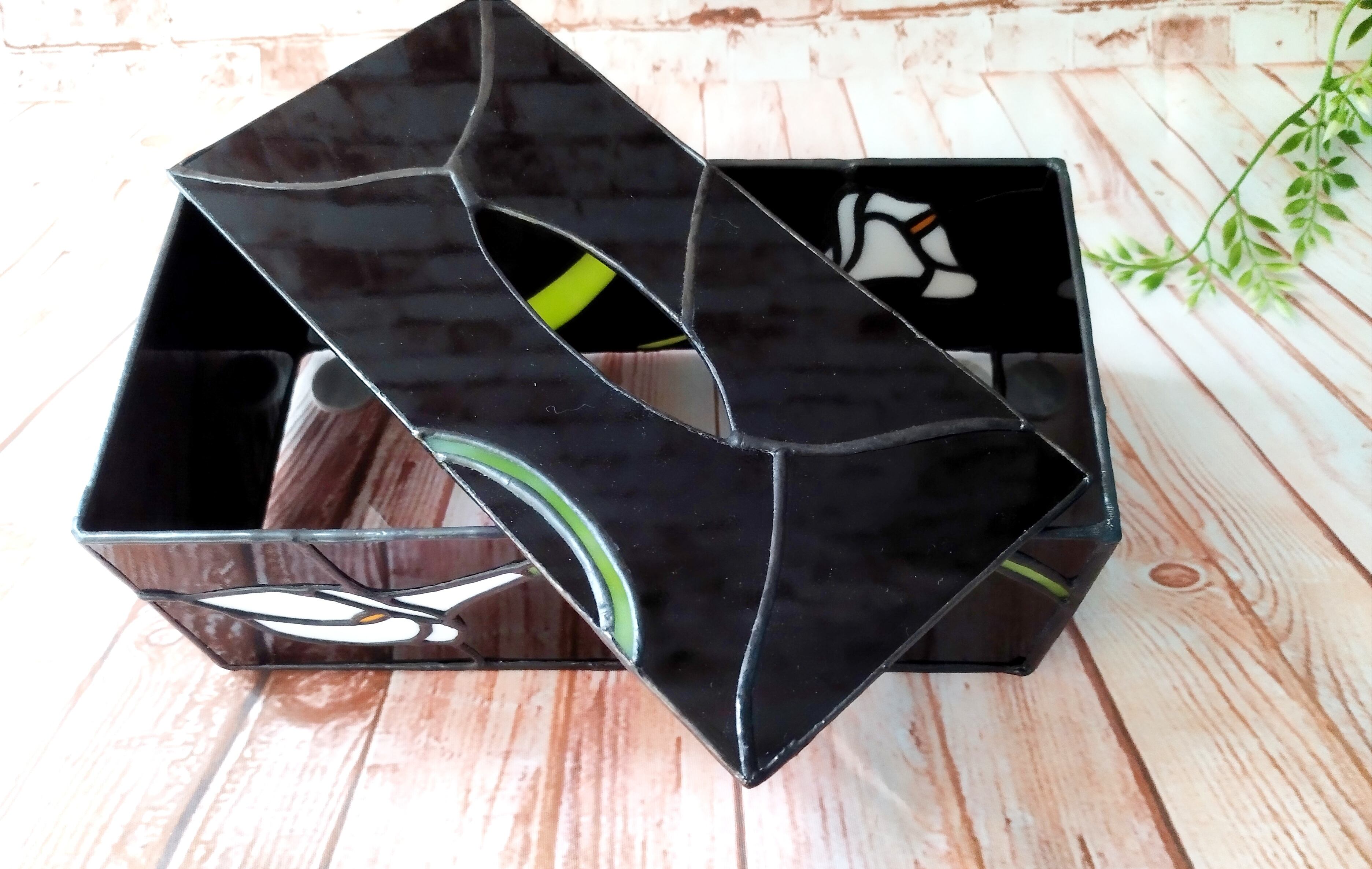ステンドグラスで作られました、ティッシュボックスのカバーです。高級なブラックガラスと白いエレガントのカーラーの花移りました。普通のNepia の ティッシュボックスにはピタリのサイズです。ふたは固定していない、ティッシュボックスの上に置くタイプです。ティファニーのステンドグラス技法で作られています。