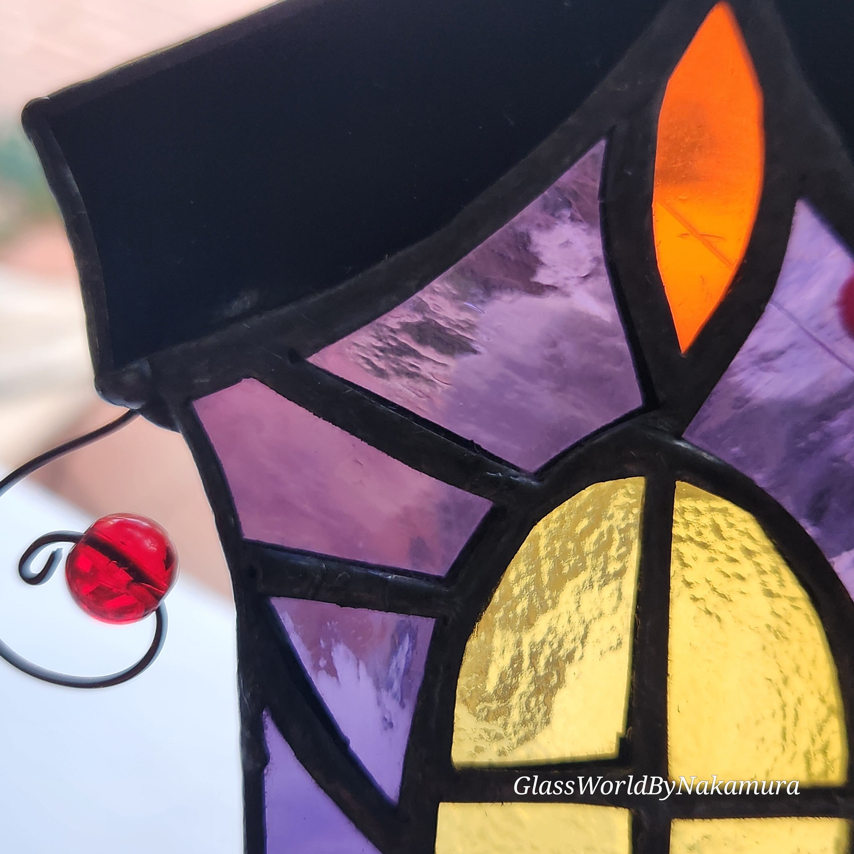 ハロウィーンの窓デコレーションイン、サンキャッチャーです。ハンテッドマンションや、ウィッチの家をイメージした作品です。